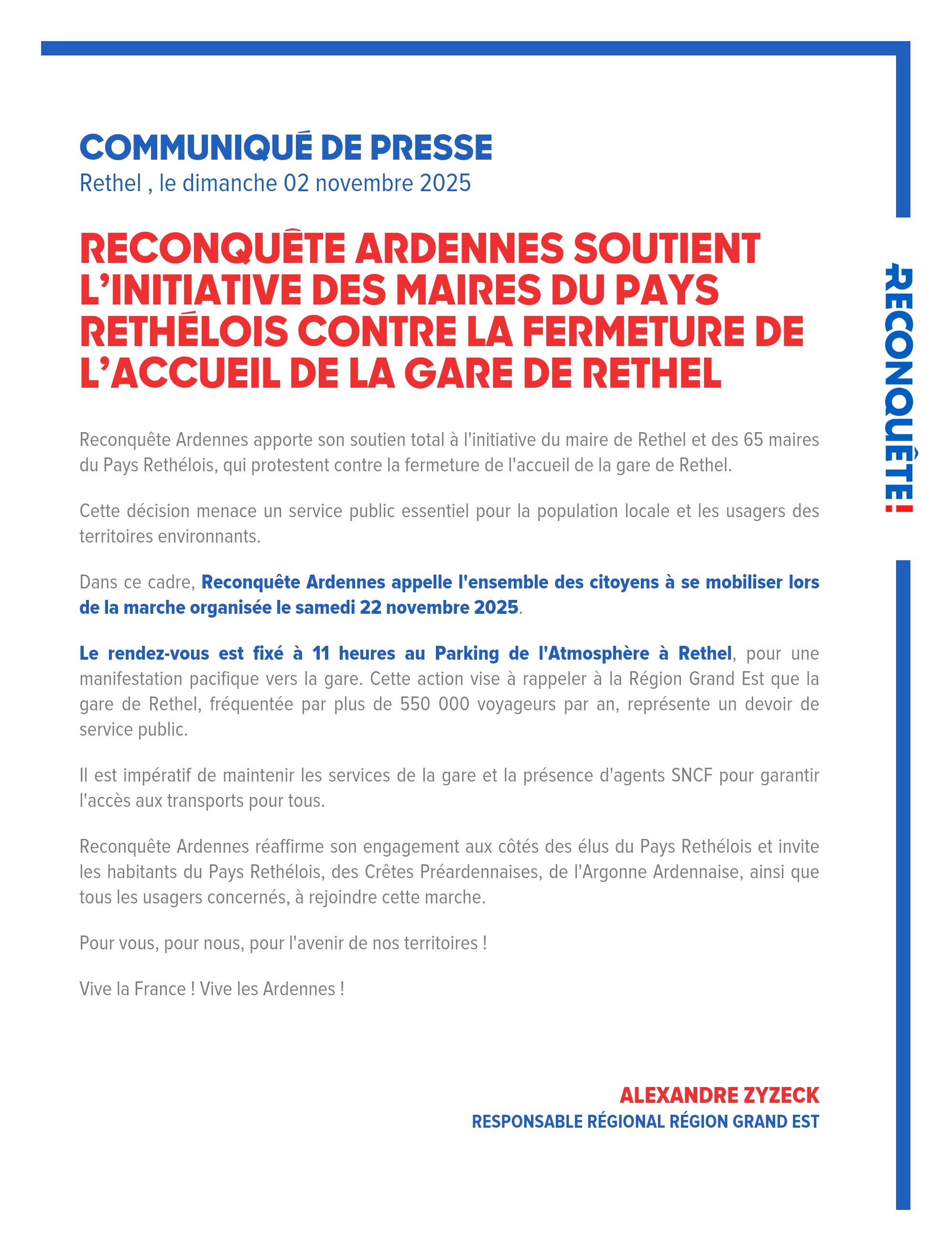 Reconquête Ardennes réaffirme son engagement aux côtés des élus du Pays Rethélois et invite les habitants du Pays Rethélois, des Crêtes Préardennaises, de l'Argonne Ardennaise, ainsi que tous les usagers concernés, à rejoindre cette marche.